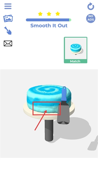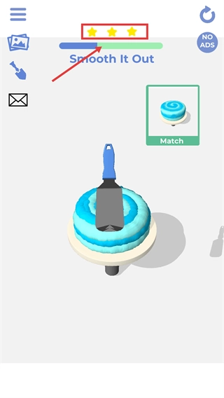 在【Smooth-It-Out】关卡里,借助工具打磨蛋糕的表层,朝着右侧【Match】展示的蛋糕样式进行调整,以此推进三星的达成进度。