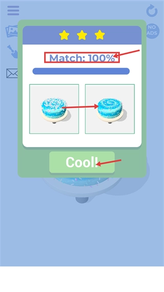 达成【Match:-100%】的匹配度后,点击【Cool!】确认装饰效果,即可完成当前关卡的蛋糕装饰任务。