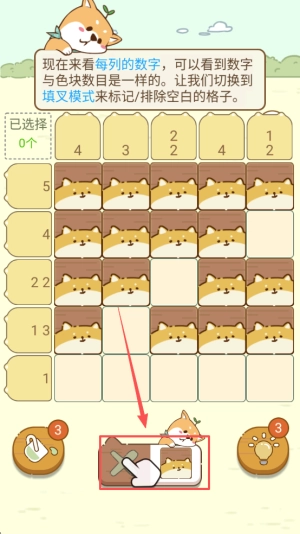 切换模式的操作方法是:在提示界面点击填叉,通过标记空白格子来继续闯关。
