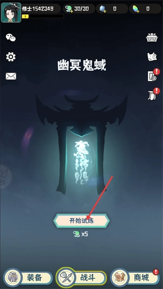 进入【幽冥鬼域】界面后,底部的【战斗】按钮即为试炼入口,点击【开始试炼】时需要消耗5个绿色道具。