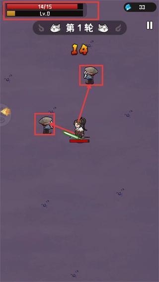 当前战斗进行到【第1轮】,目标是攻击头戴斗笠的敌人;界面顶部的【14/15】代表进度条状态,【Lv.0】标识着当前等级,右侧还有【33】颗蓝色钻石可供留意。
