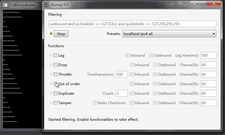 clumsy 首先根据用户选择的 filter 来拦截指定的网络数据。在 filter 中可以设定你感兴趣的协议(tcp/udp),端口号,是接收还是发出的端口。你也可以通过简单的逻辑语句来进一步缩小范围。当 clumsy 被激活时,只有符合这些标准的网络数据会被进行处理,而你不感兴趣的数据仍然会由系统正常传输。当被 filter 的网络数据包被拦截后,你可以选择 clumsy 提供的功能来有目的性的调整网络情况: