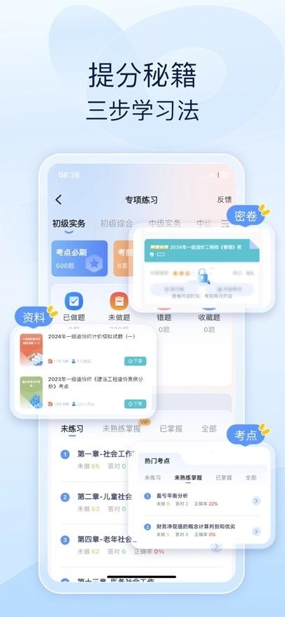 1、章节练习:依据教材各章节及对应知识点设计题目并进行押题,全方位强化对每个知识点的掌握。