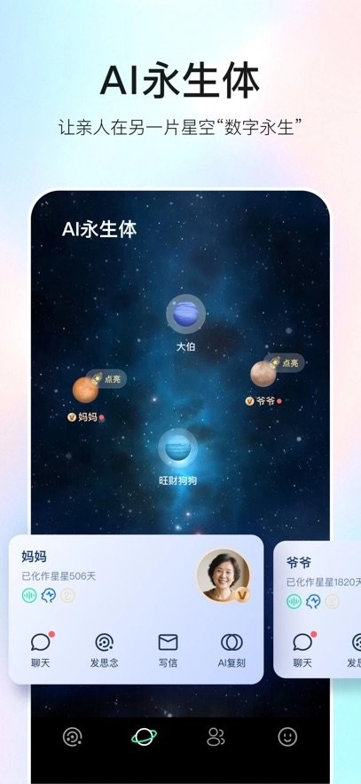 这是一款能与AI复刻的亲人进行音视频通话聊天的软件,通过人工智能技术还原亲人的思维、声音和容貌,让用户得以和身处“另一片星空”的亲人交流互动。对每一位用户来说,再次听见逝去亲人的声音,是深藏心底最柔软的期盼,也是宛在AI一直以来最想为大家达成的心愿。