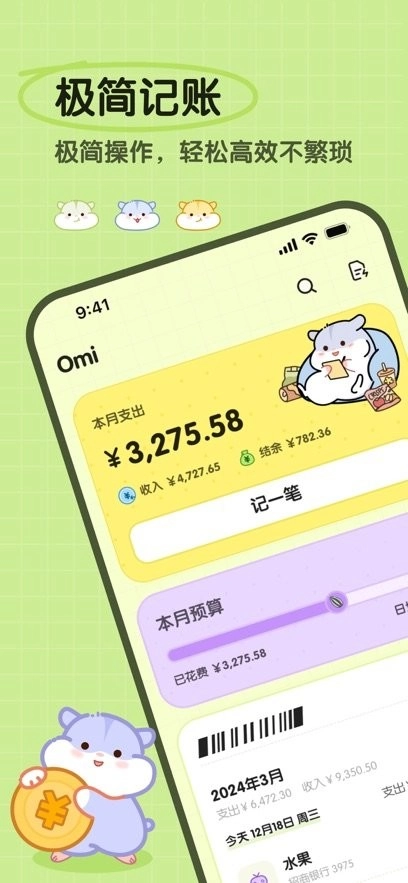 Omi 记账是一款高效便捷的智能记账工具,提供多种快捷记账方式,帮助你高效记录收支,更科学地管理个人财务。萌趣的小仓鼠 Omi 会化身你的专属财务管家,协助你规划每一笔资金流向,让你清晰掌握每笔开销的去向,陪伴你逐步养成坚持记账的好习惯~