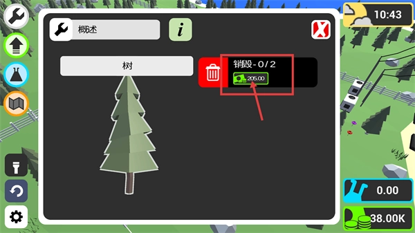 点击树打开【概述】界面,查看【销毁-0/2】的任务目标,确认需消耗205.00单位对应资源后,即可准备执行树的销毁操作。