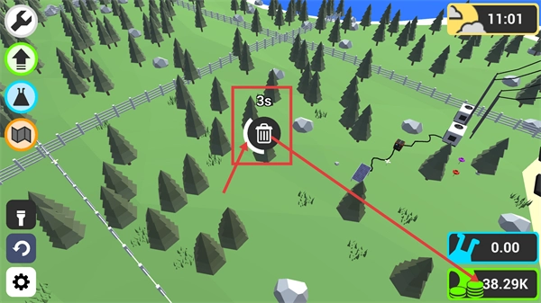 在主界面里,找到带有定位标注的树,目前这些树对应的资源可用量是38.00K,先把它们的位置锁定好,这样能为之后进行销毁操作和布置设施打下前期基础。
