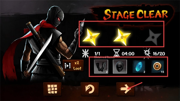 通关之后,打开【STAGE-CLEAR】界面,就能领取【装备-2】【宝石-2】这类奖励,还可以选择开启下一关。