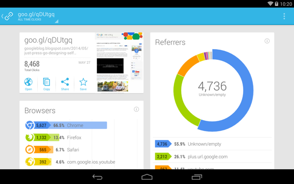 Google URL Shortener是一款手机端的url缩短工具,也就是网址缩短工具,可以让你方便的把网址进行短链并且分享给大家,同时还可以进行详细的统计和分析。