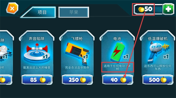 在道具界面使用【40】个【苹果】可以兑换【电池】,该电池适用于电动类道具,能帮助后续进行机关互动。