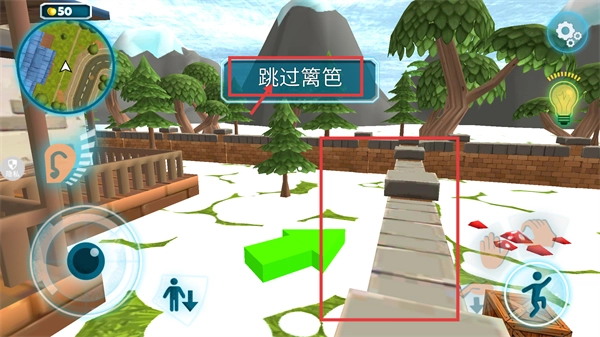 利用已摆放好的板条箱,点击跳跃按钮来完成【跳过篱笆】的动作,从而进入新的场景区域。
