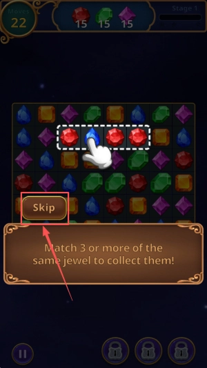 学习规则:在关卡提示页面仔细阅读“Skip”的相关说明,要记住只要将三颗相同颜色的宝石连在一起就能完成消除操作。