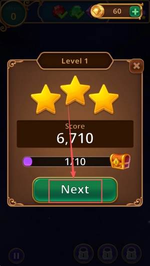 领取奖励的方式:通关后查看结算页面,确认显示60分和6710积分,然后点击“Next”按钮进入下一关。