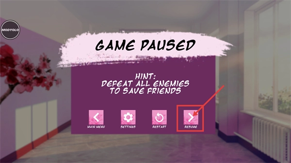 在暂停界面里,按照【HINT:-DEFEAT-ALL-ENEMIES-TO-SAVE-FRIENDS】的提示操作,点击【RESUME】按钮就能继续进行游戏。