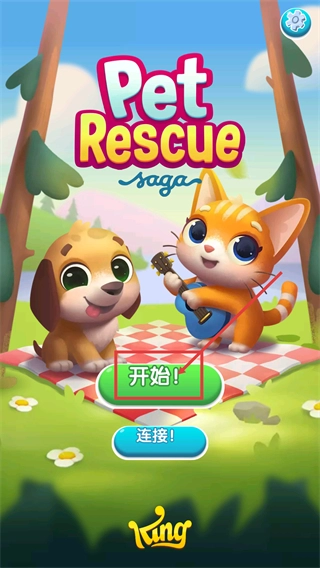 进入【Pet-Rescue-Saga】界面后,先点击【开始!】按钮开启关卡,暂时不需要操作【连接!】,优先推进游戏进程。