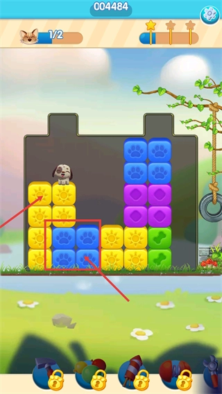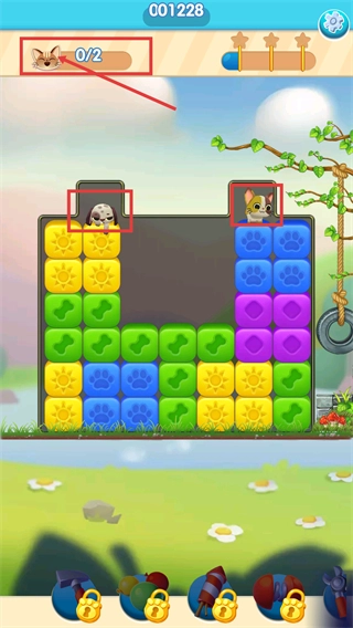 把消除玩法和救援任务深度结合,玩家通过清除砖块让高处的宠物掉落从而获救,核心目标清晰,这样能提升闯关时的代入感。