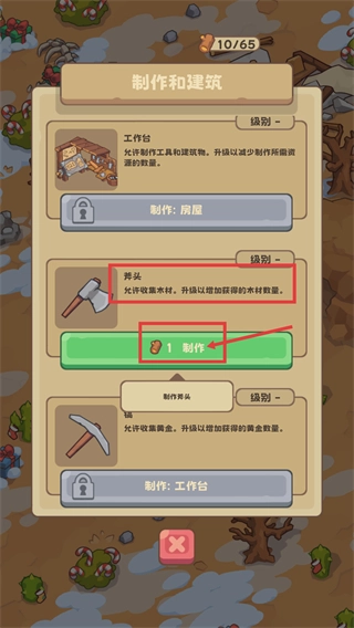 在【制作与建筑】界面,消耗【1单位木材】制作【斧头】,此工具能用来采集木材,升级之后还可以增加木材的获取数量。