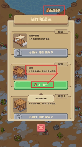 积累资源后,消耗3份木材来制作房屋,房屋具备存储食物的功能,通过升级可以扩大其存储容量,进而增强生存保障能力。