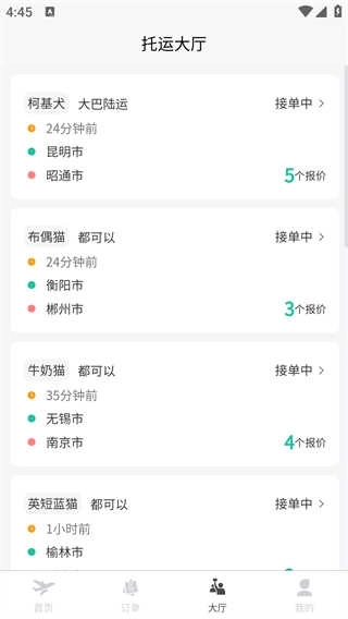 1、用户能够查看不同地区的宠物托运信息,以便进行参考和比对,从而挑选出最适合自己的托运订单来下单使用。