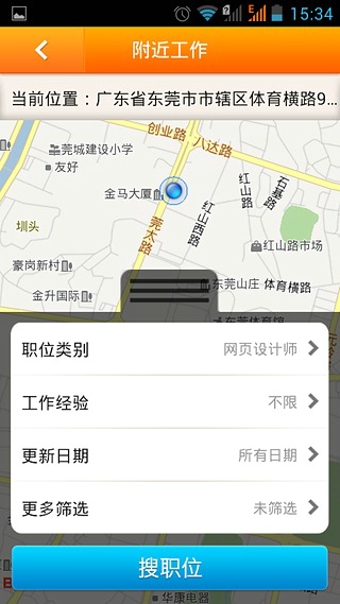 1、搜职位:优化精确搜索外,增加了附近工作,让您在地图上轻易地寻找目标地点附近的工作。