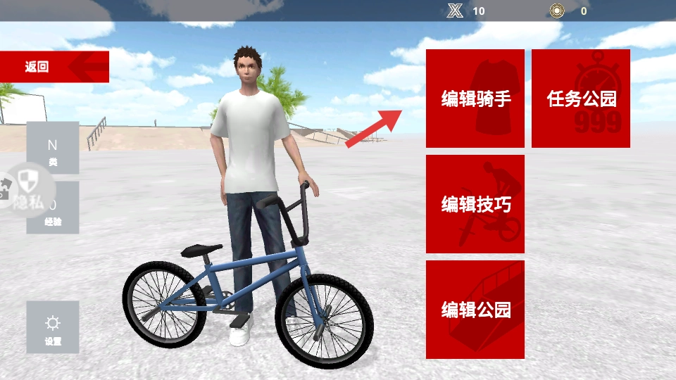 进入游戏主界面后,先熟悉【返回】等功能按钮的位置和作用,之后点击【编辑骑手】选项就能开启角色形象自定义环节,完成这些操作即可为游戏做好前期准备。