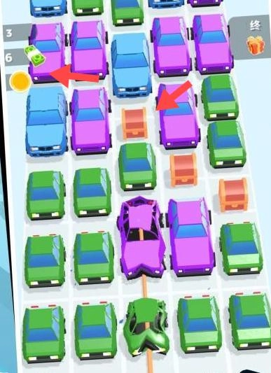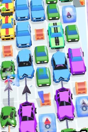 按照箭头所指的方向移动车辆,通过把相同颜色的车辆合并来推进游戏进程,同时要注意观察场景里的道具图标。