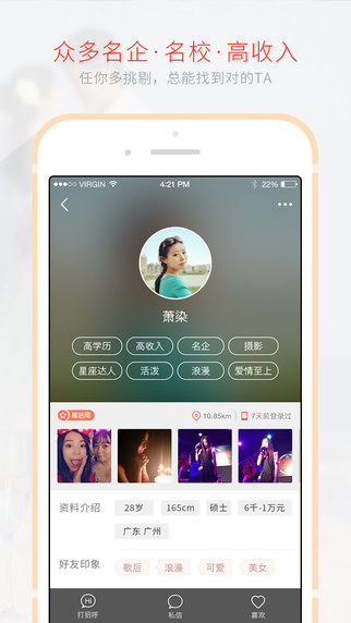 优质用户,高学历、高收入、名企、名校的优质人士,都在花田喔!免费沟通,随时随地与心仪的Ta保持联系喔!