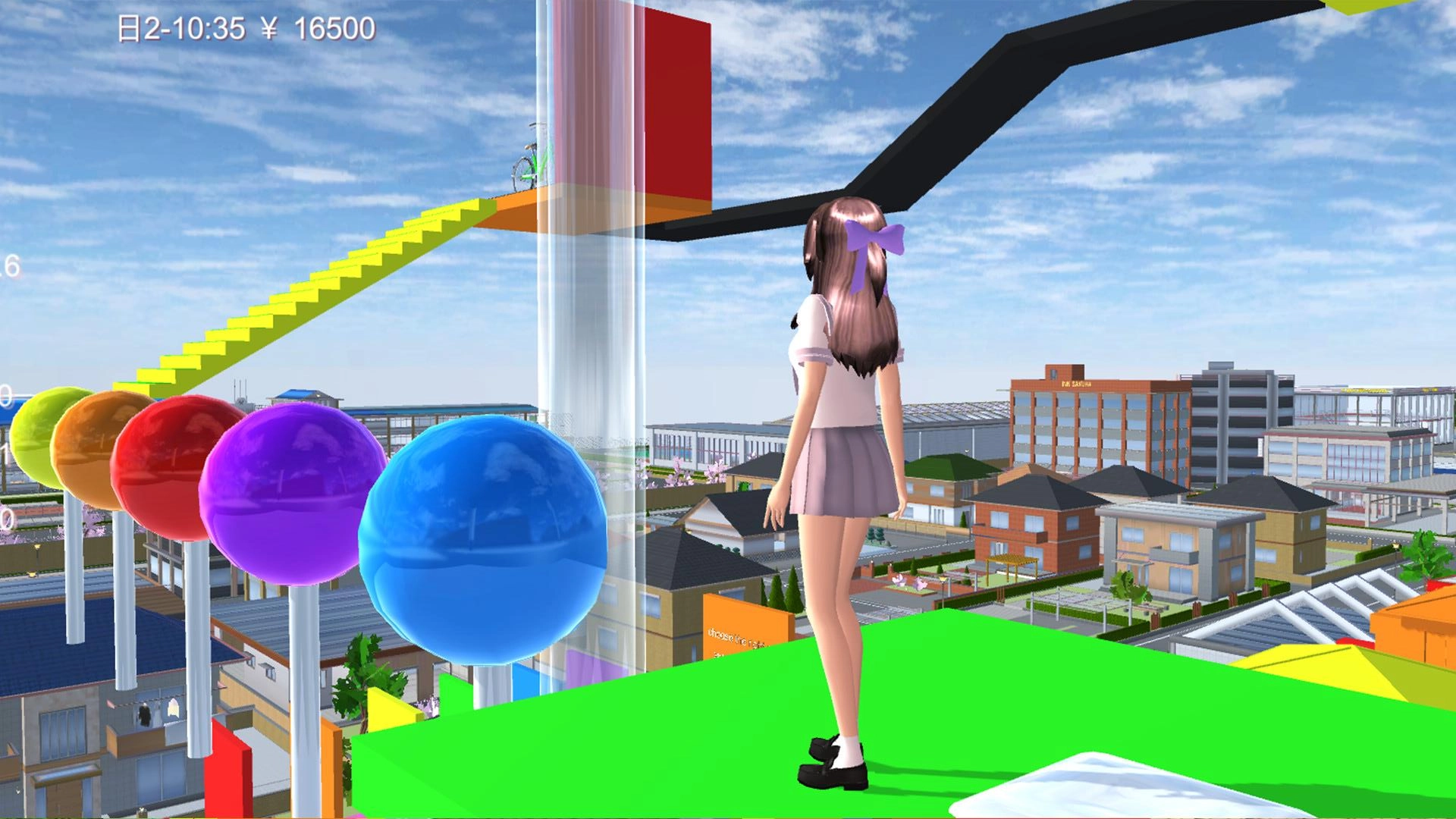 场景的色彩十分鲜艳,建筑与道具的造型别具一格,像彩色的阶梯、巨大的球体这类元素,给人带来强烈的视觉冲击。