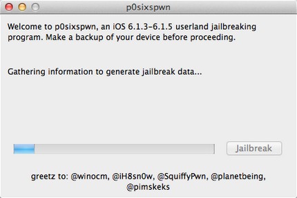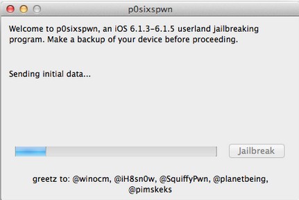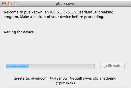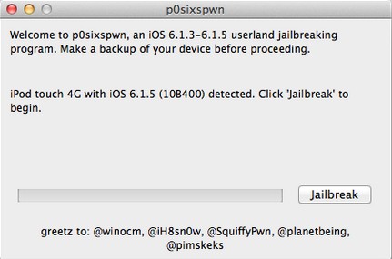本次p0sixspwn mac版越狱工具不需要在iOS设备上操作,越狱过程请勿断开设备连接。肥x经测试:iPod Touch4 、iPod Touch5、iPhone 4(GSM) 6.1.3、6.1.5固件越狱暂没发现问题。越狱过程大概需要10分钟左右(与网络环境相关),请耐心等待《p0sixspwn》提示完成。【使用方法】