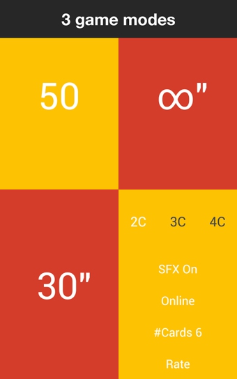 游戏分为3种模式(50秒,无限世界,30秒);3种难度关卡(2种颜色,3种颜色,4种颜色)还能与你的Facebook好友进行挑战哦~喜欢挑战的玩家不妨来和你的小伙伴们比比谁的手速更快吧!