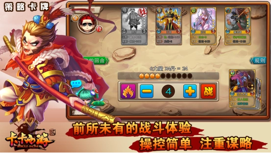 《卡卡西游2》作为一款以经典西游神话为题材的战斗卡牌游戏,玩家将化身天命之人,在国风水墨风格的浮世绘卷场景中,借助策略卡牌来指挥各路仙妖豪杰。游戏打破了传统回合制的束缚,创新推出天地五行战场机制,再搭配法宝熔炼与羁绊觉醒系统,为玩家带来更具深度的策略博弈体验。