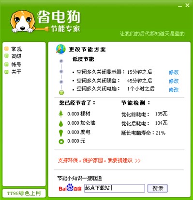 省电狗是一款节能软件,不需要过多的设置,不知不觉就会为您节省电能、延长电脑寿命。它可以把你节省下来的电能用数字表示出来,折算成节约的树和石油,让使用者认识到节约电能不但可以降低能耗,从而对生态环保做出贡献!
