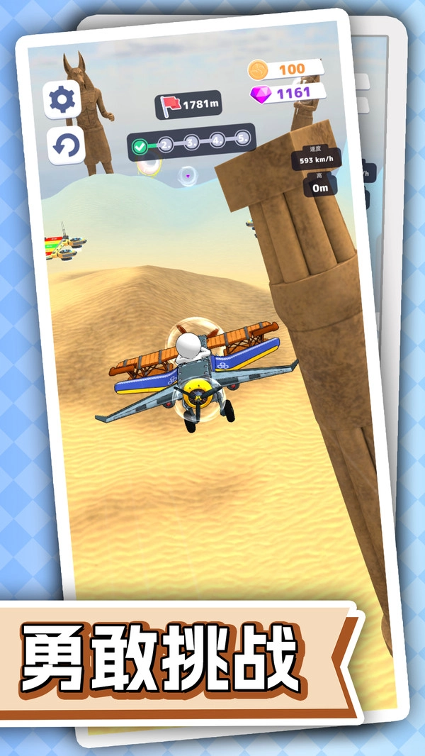 驾驶组装好的飞机,穿越雪地沙漠等场景,躲避障碍,收集途中奖励,挑战最远飞行距离。