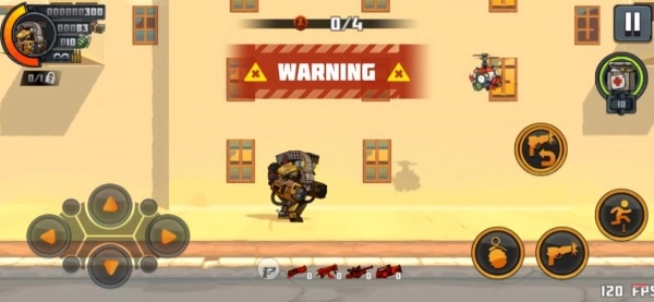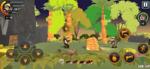 游戏采用横版动作射击玩法,玩家能够自由进行奔跑、跳跃、翻滚与射击等操作。