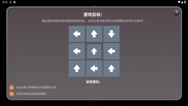 这是一款以极简风格为核心的逻辑解谜游戏,玩家需要旋转电路方块来调整电流路径,最终使整个电路通电。