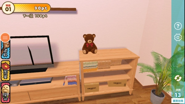 玩家会进入到个性化的房间场景里,留意并找寻随机现身的丑萌欧吉桑精灵,慢慢达成精灵图鉴的收集任务。