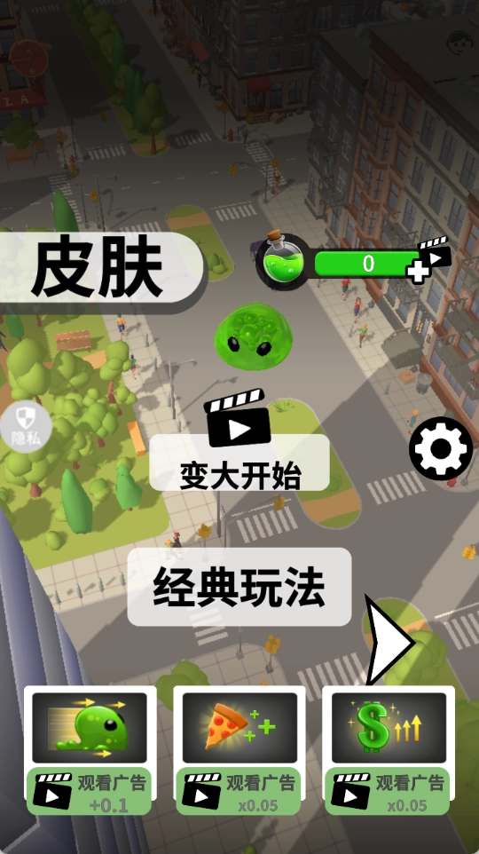 控制史莱姆在城市中移动,吞噬小物件和小史莱姆,使自身不断变大,从而获得更高的分数。