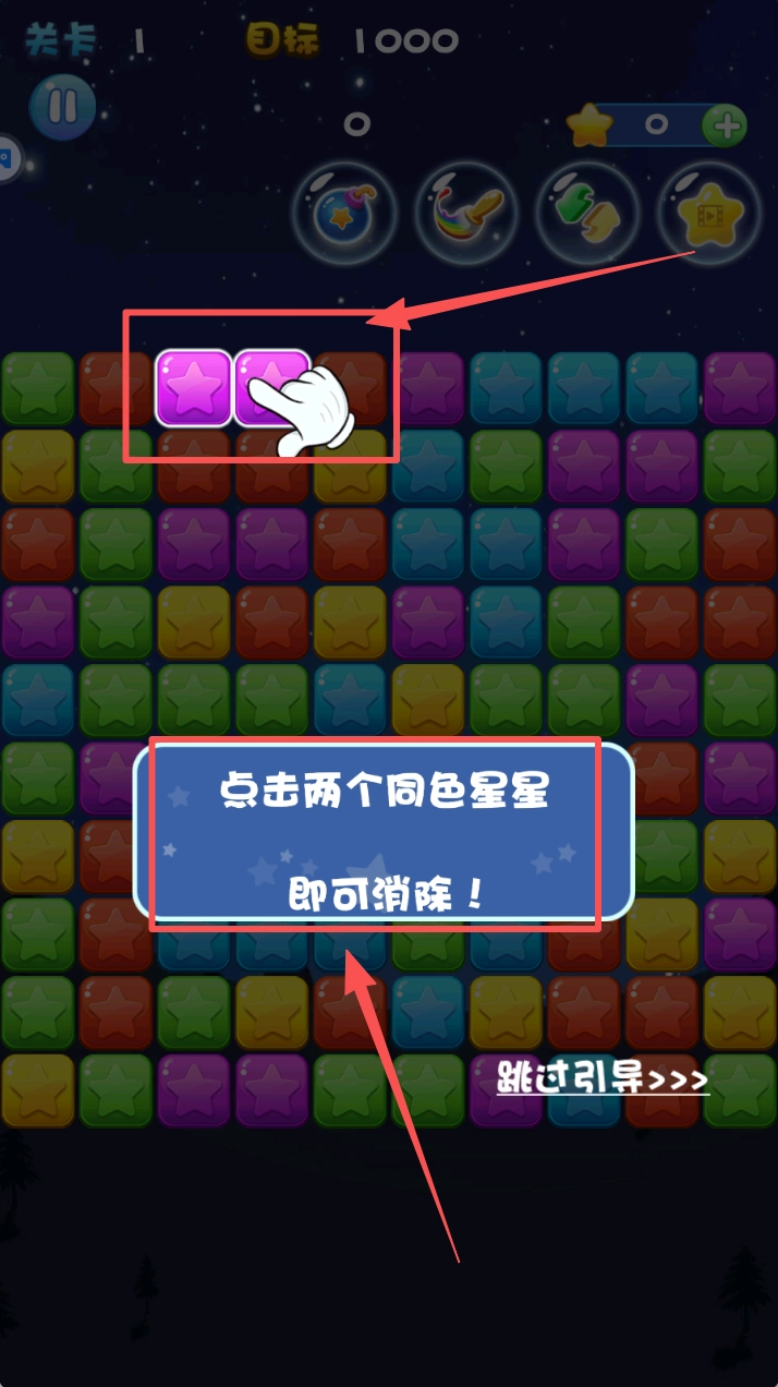 点击两颗颜色相同的星星就能消除它们,尽量一次性消除更多的星星。