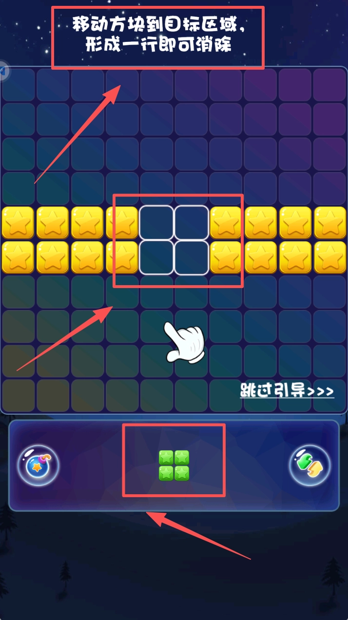 移动方块到目标区域,形成一行即可消除。