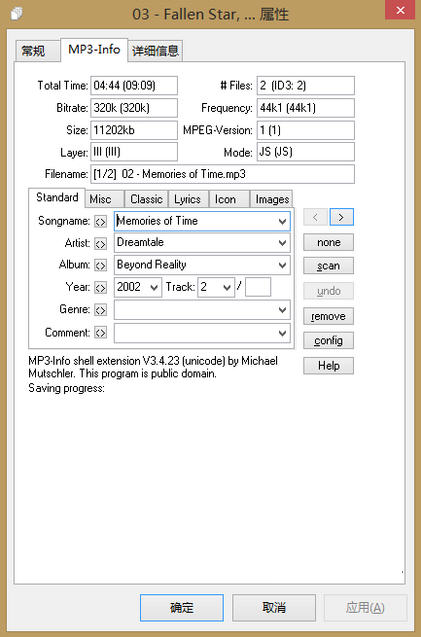 安装 MP3ext 后,MP3 音频文件的图标就已经变化了,变成了该 MP3 的取样率数字,如上图 320 就是表示该 MP3 文件的取样率是 320Kbps。同时鼠标悬停在 MP3 文件上时会显示该 MP3 的信息以及 ID3 标签信息。当然不是所有的 MP3 文件都有完整正确的 ID3 信息,你可以选中 MP3 文件然后点击鼠标右键属性,在 MP3-Info 标签页内进行编辑,MP3ext 支持多个文件同时编辑,而且无需要重新打开一个新的软件来编辑,十分方便。