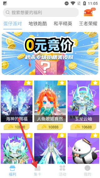 1、在福利页面,点击底部【集卡】按钮,进入集卡页面。