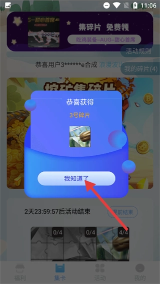 4、在碎片获取界面,获得碎片后点击【我知道了】按钮,完成本次集卡福利领取操作。