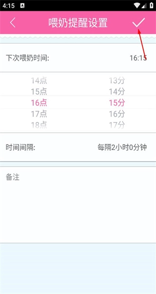 2、在喂奶提醒设置页面,设置下次喂奶时间和时间间隔,点击保存完成喂奶提醒设置。