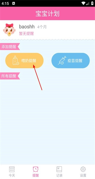 1、打开软件后,进入提醒页面,宝宝4个月暂无提醒,点击喂奶提醒进入设置页面。