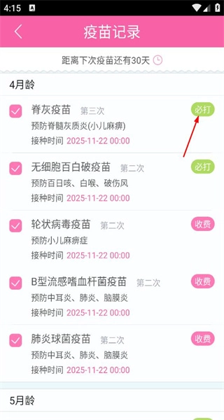 3、进入疫苗记录页面,看到4月龄的脊灰疫苗等,标注必打或收费,点击疫苗查看详情。