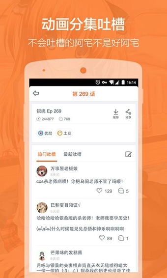 点击【吐槽】,可以看到网友们针对各个新番动画所提交的吐槽文字。