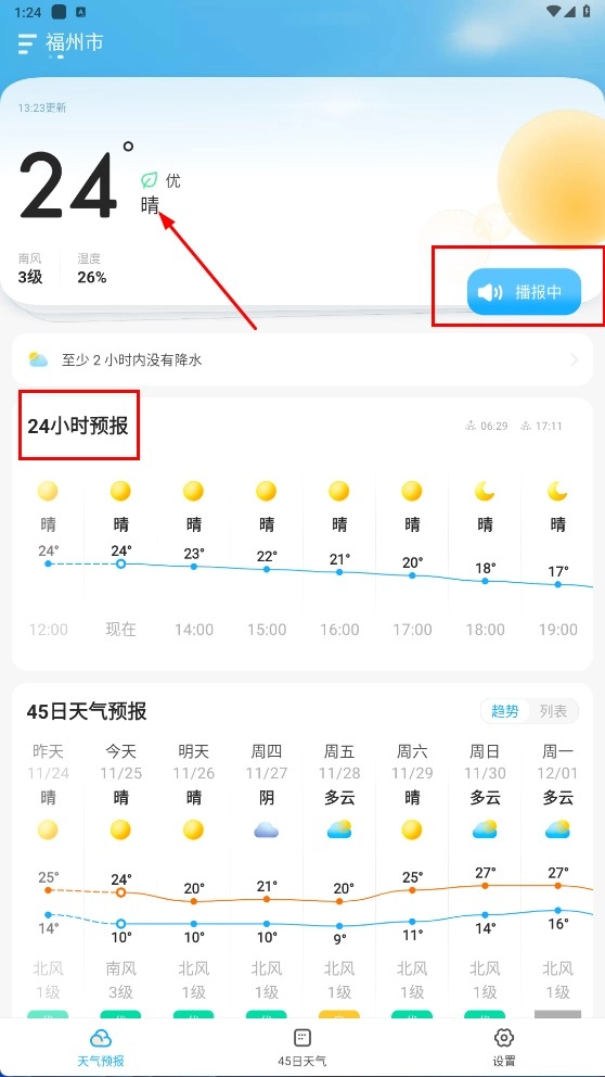 2、进入城市天气页面后,查看【24小时预报】和45天预报,还能点击【播报】按钮收听天气语音播报。
