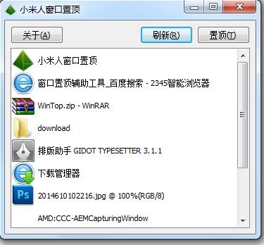 版本:1.2,发布日期:2014-06-09(1)记录窗口置顶状态,精简界面,自动检测指定窗口的置顶状态,一键切换。