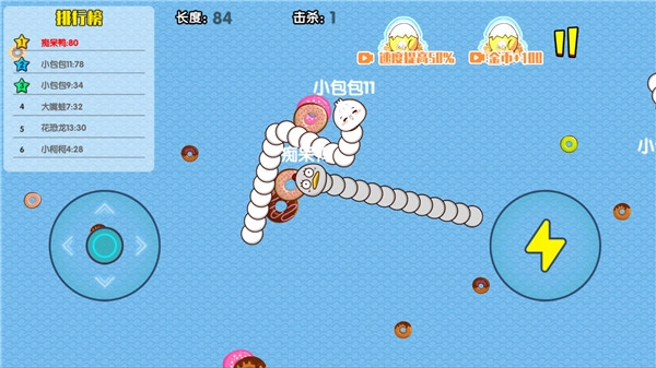 3、得分主要来自吃蛋,当你的蛇用身体围成一个闭合圈,将其他小蛇困在圈内并使其无法移动时,被困小蛇会变成蛋。