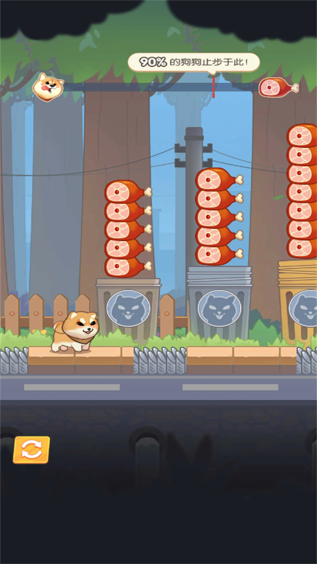 按下蓄力键时留意场景,把握好松开按键起跳的时机,躲开垃圾桶之类的障碍,精准吃到火腿。